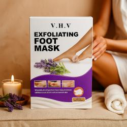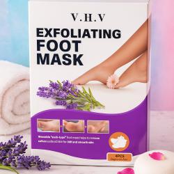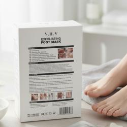 Марка/Модел: Ексфолираща маска за крака V. H.V тип чорап; Съдържание: 4бр. маски; Основни активни съставки: урея, млечна киселина; Подхранващи екстракти: Алое, Центела, Полигонум, Скутелария байкалска, Зелен чай, Женско биле, Лайка, Розмарин, Хидролизиран колаген и др.; Време за приложение: 20–30 минути; Резултат: постепенно лющене на удебелената кожа; гладкост до 1–2 седмици след процедурата; Указания за употреба: Измий и подсуши краката. Отвори маските, обуй и запечатай. След 20–30 минути свали, измий с топла вода и подсуши; нанеси подхранващ крем. За по-добър ефект – накисване в топла вода след 4-тия ден; Внимание: Не използвай върху слънчево изгоряла, разранена или свръхчувствителна кожа. При дискомфорт прекрати употребата. Съхранявай на хладно и далеч от деца.