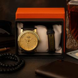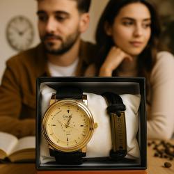 Механизъм: Quartz (батерия; не изисква навиване); Корпус: метал със златисто покритие, кръгла форма; Циферблат: шампанско-златист, фина текстура, златисти стрелки и индексни маркери; Каишка: черна еко кожа, регулируема, закопчаване тип катарама; Водоустойчивост: не е предназначен за плуване/душ; В комплекта: часовник + текстилно-кожена гривна с метална плочка и надпис „World Peace“ (превод: „Световен мир“) + подаръчна кутия; Стил и употреба: ежедневен/елегантен, подходящ за подарък и за лично ползване.