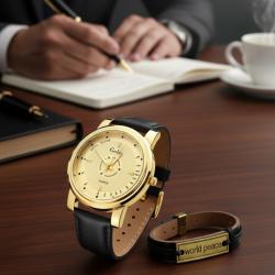 Механизъм: Quartz (батерия; не изисква навиване); Корпус: метал със златисто покритие, кръгла форма; Циферблат: шампанско-златист, фина текстура, златисти стрелки и индексни маркери; Каишка: черна еко кожа, регулируема, закопчаване тип катарама; Водоустойчивост: не е предназначен за плуване/душ; В комплекта: часовник + текстилно-кожена гривна с метална плочка и надпис „World Peace“ (превод: „Световен мир“) + подаръчна кутия; Стил и употреба: ежедневен/елегантен, подходящ за подарък и за лично ползване.