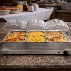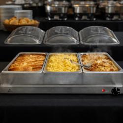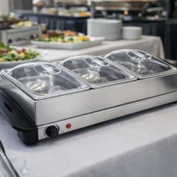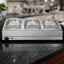 Технически характеристики на Електрически нагревател за бюфет 2 в 1 - винаги топла храна KN24 Ключовите спецификации гарантират, че получавате мощен и безопасен уред: Марка: Cheffinger Капацитет: 3,5 кварта общо; 3 контейнера по 2,5 L (споменати и 2,4 L в някои описания) Мощност: 300W Максимална температура: до 175°C Контрол: ротационен контрол за прецизно нагряване Материали: неръждаема стомана корпус и контейнер; акрилни капаци; дръжки от бакелит Размери: приблизително 65.03 cm x 38.1 cm x 15.24 cm Тегло: около 10.6 lb