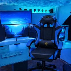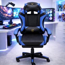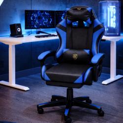 Общи размери: 66 см (ширина) x 60 см (дълбочина) x 106 см (височина) Вътрешна структура: броннирана метална рамка Пълнеж: New Foam, дебелина до 7,5 см Тапицерия: PU екокожа — издръжлива и лесна за почистване Основа: подсилен наситено черен найлон с колелца Система за релаксация: лумбална възглавница с масаж, USB захранване Дизайн: геймърски, ергономична форма с удобна поставка за крака