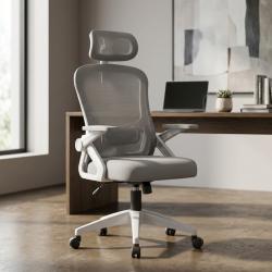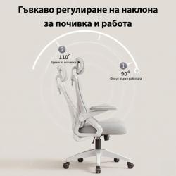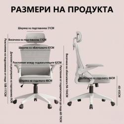 Технически характеристики на Ергономичен офис стол с регулируема лумбална опора и облегалка за глава – комфорт и стабилност до 150 кг Размери и настройки, видими и измерими: Ширина седалка: 46 см; дълбочина седалка: 46 см. Ширина облегалка: 47 см; височина на облегалката: 94–104 см. Регулируема височина на седалката: 40–45 см. Разстояние от подлакътник до земя: 60–70 см; разстояние между подлакътниците: 62 см. Облегалка за глава: ширина 31 см, височина 17 см, вертикална настройка до 9,5 см и възможност за промяна на ъгъла. Товароносимост: до 150 кг; основа: здрава 5-точкова метална основа; движение: 360° въртене и тихи колела за твърди подове.