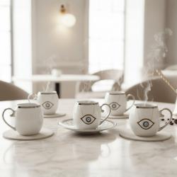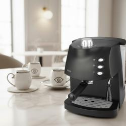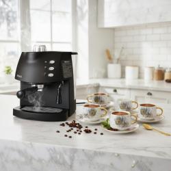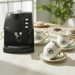 Еспресо машина MUHLER: Термометър за индикация на температурата; Размер: 28х33х28см; Светлинни индикатори: Показват готовността на помпата и на парната дюза; Надеждна защита от прегряване и високо налягане; Подвижна поставка за събиране на капките; Лесна за почистване; Помпа за постоянно налягане 15 Bar; Подвижен резервоар: 1.8 л.; Мощност: 925W; Напрежение: 220-240V, 50-60 HZ; Двоен филтър за смляно кафе; Цвят: Черен; Луксозен сервиз за кафе (6 чаши + 6 чинийки): Комплект от 6 чашки с чинийки; Материал: висококачествен порцелан; Кант: златен или сребърен; Вместимост: приблизително 80–90 мл; Подходящи за горещи напитки; Предлагат се в три красиви варианта: Evil Eye – защита, лукс, символика - златен или сребърен; Royal Feather – кралски чар, фин детайл, нежност.