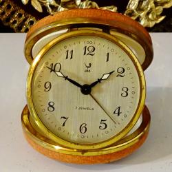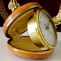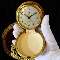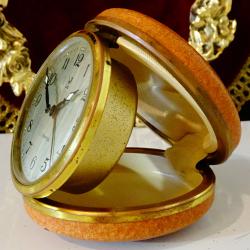 Този часовник е произведен през 1970 година. Има перфектен бронзов механизъм със 7 броя рубини. Работи свръх точно, звъни коректно. Кутията е тапицирана с естествена кожа, удостоверено с печат Cuir Veritable. Има светещи стрелки и точки над цифрите. Стъклото е безупречно. Диаметър на кутията 8 см. Перфектен часовник за ползване и колекция.