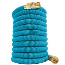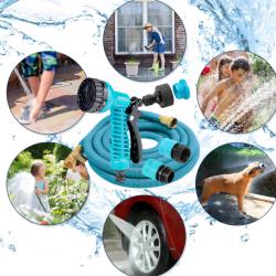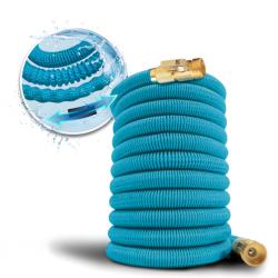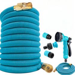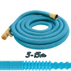 Технически характеристики на Гъвкав градински маркуч с медни накрайници - без заплитане и прегъване Конкретни данни за максимална яснота: Дължина: 5 м (сгънато) / 15 м (разтегнато) Вътрешен диаметър: 6 × 10 мм Външна обвивка: 3750D полиестер (син) Конектор: алуминий с меден клапан; медни накрайници Устойчивост: устойчив на усукване, прегъване и интензивна употреба Състояние: нов, фабрично сглобен Приложения: поливане на градина, саксии, измиване на автомобили, почистване на дворове, оранжерии и др.