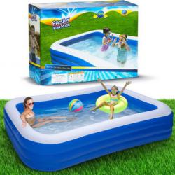 Технически характеристики на Голям надуваем семеен басейн Техническите параметри гарантират сигурност и дълготрайност: Марка: Семеен басейн Материал: PVC с дебелина 0,32 мм Цвят: син и бял Вместимост: 850 литра Размери: 305 x 180 x 60 см Тегло: 7,5 кг