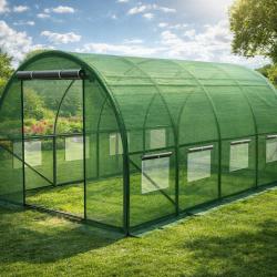 Спецификацията прави избора лесен и уверен: Размери: 4 × 2,5 × 2 м Сегменти: 4 Фолио: PE 140 г/м² с UV4 филтър Вградена PP мрежа за усилване Рамка: поцинкована стомана, тръби Ø 25 мм, дебелина 0,65 мм Прозорци: 8 броя с мрежи против комари, закрепени с велкро Врати: ролкови с цип, възможност за навиване и фиксиране Допълнителни елементи: колчета, връзки за връзване на растения, 2 тръби за увивни растения, 8 стълба 11 × 120 см Долен як за заравяне в почвата за допълнителна защита