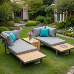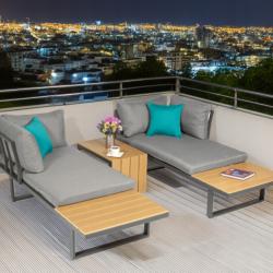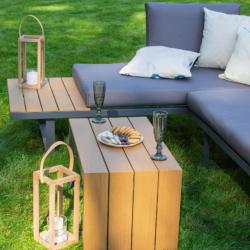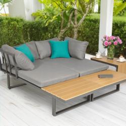 Рамка: прахово боядисан алуминий Плотове: полидърво (влагоустойчиви) Възглавници: висококачествен полиестер, лесен за почистване Товароносимост маса: до 50 кг Товароносимост диван: до 300 кг Размери маса: 70 x 40 x 40 см Размери диван (приблизителни): височина 80 см, дълбочина 70 см, височина на седалката 40 см, дължина 130 см Цвят: сив, с възможност за комбиниране с цветни възглавници