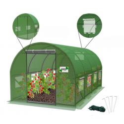 Технически характеристики на Градиснка оранжерия New Solution - отлична защита за вашите култури - 4 х 2,5 х 2м Размери: 4 × 2,5 × 2 м Сегменти: 4-сегментен тунел Фолио: PE 140 г/м² с UV4 филтър и зелена PP мрежа Рамка: поцинкована стомана, тръби Ø 25 мм, дебелина 0,65 мм Врати: пълно затваряне + навиване, размер 80 × 180 см Прозорци: 9 броя с мрежи против комари, закрепени с велкро Почвена яка: да, за заравяне и уплътняване Аксесоари: усилващи колчета, връзка за връзване, две тръби за катерачи