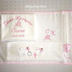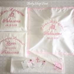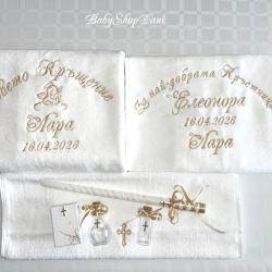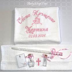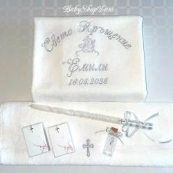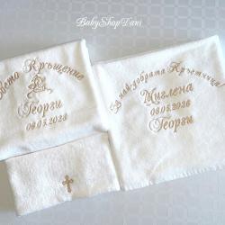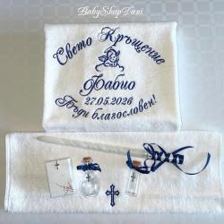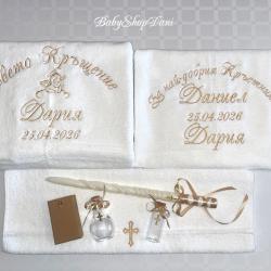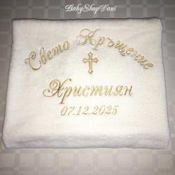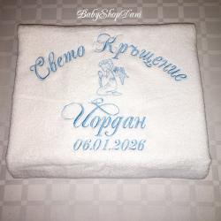 1. За Кръщелник/Кръщелница - Базов модел 1 - цена 33.00 лв / 30.00 лв без Ангелче/Кръстче ИЛИ без дата /: Хавлия бяла, 70х140 см, 450 гр, българска, с бродерия: < Свето Кръщение + Име + Дата + Ангелче / или Кръстче / > На хавлия 500 гр - 36 лв (препоръчано! - снимки обява) 1.1 Базов модел 1 на хавлия 50х90 см 450 гр - 27.00 лв (или на хасе 50х100 см, окрайчено с дантелка) 2. Хавлия за Кръстник / Кръстница - Базов модел 2 - цена 22.00 лв: Хавлия бяла, 70х90 см, 500гр, българска, с бродерия: < На най-добрия Кръстник! + Дата + Име / на Кръщелник> 2.1 С две имена (и на Кръстник/ца) - 25.00 лв, с 3 имена, за двама Кръстници - 28.00 лв 2.2 Вариант със стихче - 32 лв / + име на Кръстник/ца - 35 лв 3. Миро - цена 14.00 лв, хасе, 50х100 см, с бродерия: < Ангелче / или Кръстче / + монограм две букви > < Ангелче / или Кръстче / + ИМЕ > - 17.00 лв 4. Свещ - 35 см, със златно или сребърно ламе, украса в тон - цена 10.00 лв 5. Кутийка за косичка, с кръстче - 3.00 лв 6. Шишенце за миро 25 мл, украса в тон - 3.00 лв 7. Колбичка/бурканче за мед 50 мл, украса в тон - 5.00 лв 8. Хавлия за църквата с бродирано кръстче/ангелче 100 % памук българска: - 30х50 см 400 гр - 7.00 лв - 50х90 см 500 гр - 10.00 лв С избор на цвят и шрифт (ръкописен/църковен/старобългарски/печатен) на бродерията, части - за комплекти. С опция по избор, за индивидуални поръчки и/или за добавяне на: - допълнителен текст - 0.50 лв х буква/символ / Кръстник + Име, Бъди благословен!... друго/ - допълнителни елементи/орнаменти, лаврови клонки/ - по договаряне / 3.00 лв х 1 бр - украса широка дантела - 5.00 лв, двойна 8.00 лв Поръчайте харесания от Вас модел със съобщение: - на телефон/вайбър за поръчки 0897657505 - от страницата ни във Фейсбук - Babyshopdani - тук СРОК ИЗРАБОТКА И ДОСТАВКА *: За сметка на клиента, с ЕКОНТ, на личен адрес или офис ЕКОНТ: - до 2-3 раб. дни / хавлия - до 3-5 раб. дни / комплекти, с части по избор Според натоварването за периода. * В периода 15 Май - 30 Август - станд. срокове са валидни (при възможност) за поръчки с дати до 10 кал. дни от датата на поръчката. За по-късни дати - по договаряне (+ ~ 2/3 раб. дни) Поръчки по телефон и електронни канали /ЛС Фейсбук, Вайбър, мейл, сайт/ се приемат без прекъсване: - 07: 00-22: 00 ч /На тел. за поръчки, Събота и Неделя вкл. -10: 00-18: 00 ч/ Поръчки изпратени след 22: 00/18: 00 ч се обработват и потвърждават на следващия ден. В случай, че не получите информация / потвърждение на поръчката в рамките на 24 ч след изпращането й, моля да се обадите на телефона за поръчки за проверка на статуса й. ЕКСПР. ПОРЪЧКА +25-30 % (при възможност) - прием до 12: 00 ч, без Събота: - за основна хавлия/+за дарение на църквата/ - до 48 часа - за комплект - базов вариант, с 6 основни части - до 72 часа ПРОМОЦИОНАЛНА ОФЕРТА (станд.) - БЕЗПЛАТНА ДОСТАВКА до офис на куриер/ЕКОНТ за поръчки: - с обща сума 80.00+ лв - с 2+ бр основна хавлия и обща сума 72.00+ лв ПЛАЩАНЕ: С наложен платеж при получаване, с опция за преглед. САЙТ - babyshopdani. com - - - #хавлиязакръщене #бродирана #бродирани #хавлия #хавлии #комплект #комплекти #кърпа #кърпи #за #кръщене #бродерия #бродиранахавлия #бродирана #кърпа #кърпазакръщене #комплектизакръщене #машинна #бродерия #бродиранихавлии #бродираникърпи #персонализирани #онлайн #поръчки #хавлиязакръстник #хавлиязакръстница #комплектзакръщене #комплектизакръщене