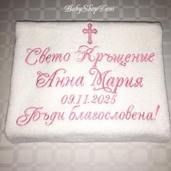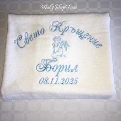 1. За Кръщелник/Кръщелница - Базов модел 1 - цена 33.00 лв / 30.00 лв без Ангелче/Кръстче ИЛИ без дата /:  Хавлия бяла, 70х140 см, 450 гр, българска, с бродерия:  < Свето Кръщение + Име + Дата + Ангелче / или Кръстче / > На хавлия 500 гр - 36 лв (препоръчано! - снимки обява)  1.1 Базов модел 1 на хавлия 50х90 см 450 гр - 27.00 лв (или на хасе 50х100 см, окрайчено с дантелка)  2. Хавлия за Кръстник / Кръстница - Базов модел 2 - цена 22.00 лв:  Хавлия бяла, 70х90 см, 500гр, българска, с бродерия:  < На най-добрия Кръстник! + Дата + Име / на Кръщелник> 2.1 С две имена (и на Кръстник/ца) - 25.00 лв, с 3 имена, за двама Кръстници - 28.00 лв 2.2 Вариант със стихче - 32 лв / + име на Кръстник/ца - 35 лв 3. Миро - цена 14.00 лв, хасе, 50х100 см, с бродерия:  < Ангелче / или Кръстче / + монограм две букви > < Ангелче / или Кръстче / + ИМЕ > - 17.00 лв 4. Свещ - 35 см, със златно или сребърно ламе, украса в тон - цена 10.00 лв 5. Кутийка за косичка, с кръстче - 3.00 лв 6. Шишенце за миро 25 мл, украса в тон - 3.00 лв 7. Колбичка/бурканче за мед 50 мл, украса в тон - 5.00 лв 8. Хавлия за църквата с бродирано кръстче/ангелче 100 % памук българска:  - 30х50 см 400 гр - 7.00 лв - 50х90 см 500 гр - 10.00 лв С избор на цвят и шрифт (ръкописен/църковен/старобългарски/печатен) на бродерията, части - за комплекти.  С опция по избор, за индивидуални поръчки и/или за добавяне на:  - допълнителен текст - 0.50 лв х буква/символ / Кръстник + Име, Бъди благословен!... друго/ - допълнителни елементи/орнаменти, лаврови клонки/ - по договаряне / 3.00 лв х 1 бр - украса широка дантела - 5.00 лв, двойна 8.00 лв Поръчайте харесания от Вас модел със съобщение:  - на телефон/вайбър за поръчки 0897657505 - от страницата ни във Фейсбук - Babyshopdani - тук СРОК ИЗРАБОТКА И ДОСТАВКА *: За сметка на клиента, с ЕКОНТ, на личен адрес или офис ЕКОНТ:  - до 2-3 раб. дни / хавлия - до 3-5 раб. дни / комплекти, с части по избор Според натоварването за периода.  * В периода 15 Май - 30 Август - станд. срокове са валидни (при възможност) за поръчки с дати до 10 кал. дни от датата на поръчката. За по-късни дати - по договаряне (+ ~ 2/3 раб. дни)  Поръчки по телефон и електронни канали /ЛС Фейсбук, Вайбър, мейл, сайт/ се приемат без прекъсване:  - 07: 00-22: 00 ч /На тел. за поръчки, Събота и Неделя вкл. -10: 00-18: 00 ч/ Поръчки изпратени след 22: 00/18: 00 ч се обработват и потвърждават на следващия ден.  В случай, че не получите информация / потвърждение на поръчката в рамките на 24 ч след изпращането й, моля да се обадите на телефона за поръчки за проверка на статуса й.  ЕКСПР. ПОРЪЧКА +25-30 % (при възможност) - прием до 12: 00 ч, без Събота:  - за основна хавлия/+за дарение на църквата/ - до 48 часа - за комплект - базов вариант, с 6 основни части - до 72 часа ПРОМОЦИОНАЛНА ОФЕРТА (станд.) - БЕЗПЛАТНА ДОСТАВКА до офис на куриер/ЕКОНТ за поръчки:  - с обща сума 80.00+ лв - с 2+ бр основна хавлия и обща сума 72.00+ лв ПЛАЩАНЕ: С наложен платеж при получаване, с опция за преглед.  САЙТ - babyshopdani. com - - - #хавлиязакръщене #бродирана #бродирани #хавлия #хавлии #комплект #комплекти #кърпа #кърпи #за #кръщене #бродерия #бродиранахавлия #бродирана #кърпа #кърпазакръщене #комплектизакръщене #машинна #бродерия #бродиранихавлии #бродираникърпи #персонализирани #онлайн #поръчки #хавлиязакръстник #хавлиязакръстница #комплектзакръщене #комплектизакръщене