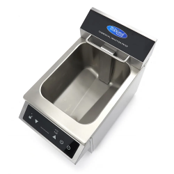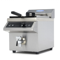Индукционен фритюрник 8 литра с LED дисплей, студена зона и таймер е съвременно решение за професионални кухни и дома. Изработен от неръждаема стомана, уредът се отличава с издръжливост, лесна поддръжка и модерен дизайн. Индукционната технология осигурява равномерно разпределение на топлината, а капацитетът от 8 литра позволява приготвяне на големи количества храна. Вграденият LED панел дава възможност за избор между 11 температурни нива от 60°C до 190°C и настройка на таймера до 120 минути. С функция за автоматично известяване при готовност на храната и сигнал за презареждане на мазнината. Практичен кран за източване, стабилни противоплъзгащи крачета и компактни размери правят този фритюрник отличен избор за бързо и безопасно готвене. Технически параметри на продукта: Тегло: 13,7 кг Размери: 29 х 50 х 41 см Размери на кошницата: 18,5 х 22,5 х 13,5 см Температурен диапазон: 60–190 °C Минимално количество мазнина: 6 л Максимално количество мазнина: 8 л Капацитет на пържене: 1,3 кг Мощност: 3,5 kW 230V / 50Hz / 1 фаза