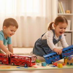 Играчките често омръзват бързо, защото не предлагат движение и реализъм. Inertia Luxury Bus решава този проблем с инерционно задвижване – само едно побутване и автобусът потегля сам! Така детето се забавлява активно, развива координацията си и се потапя в играта като истински шофьор. Изработен от здрава и безопасна пластмаса, моделът е подходящ за деца над 3 години. Предлага се в два цвята – яркочервен и наситеносин, с реалистични детайли и лъскав дизайн. Без батерии, без шум, само чисто детско въображение и движение. Размери: 46 × 8 × 11 см. Inertia Luxury Bus – побутни, пусни и гледай как приключението тръгва!