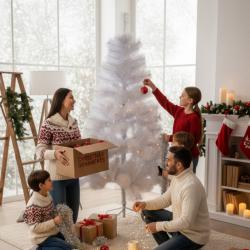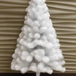Тип: изкуствена коледна елха, бяло пръскано покритие; Височини: 120 см и 150 см; Конструкция: сегментирана елха с разтварящи се клони; Стойка: стабилна четирираменна основа в сребристо; Приложение: домашни и офис интериори, търговски пространства, фотозони и витрини;