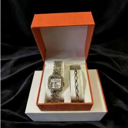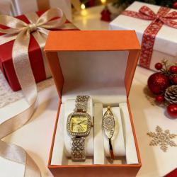 Идеален избор за подарък на любимата жена, приятелка, сестра или др. Комплектът съдържа часовник и стилна гривна в кутия - налични са 3 варианта. Циферблат: наличен в бяло, черно или жълто. Гривна: изпраща се според наличността. Материали: метален корпус и верижка с декоративни камъни; гривна с метално покритие и инкрустации. Механизъм: точен кварцов часовников механизъм за надеждно ежедневие. Кутия за съхранение: стилна подаръчна опаковка, специално подготвена за представяне. Универсален размер, лесно регулиране на верижката за удобно прилягане.