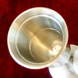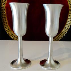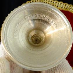 Старинен бокал, чаша на високо столче, за вино, ракия, майсторска ръчна изработка от 95% калай и 5% сребро, маркиран Praego Edles. Изключително елегантен дизайн, масивност и сребърен блясък. Височина 14 см., диаметър 5 см., тегло на всяка 150 гр. Вместимост 100 мл. Налични 2 броя, цена 39 лв., за брой.