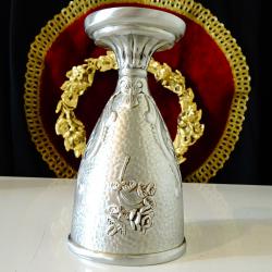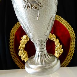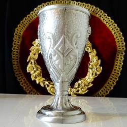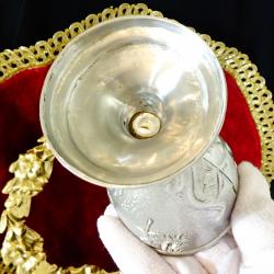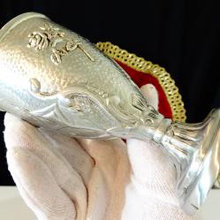Стар италиански калаен бокал, чаша за вино, повдигната на столче, майсторска ръчна изработка от 95% калай и 5% сребро. Декориран с красива релефна роза и ефектни орнаменти в стил Art Deco. Блести като сребърен от вън и от вътре, идеален за ползване, декорация и подарък за калаена сватба. Височина 14 см., диаметър 7 см., тегло 160 гр. Вместимост 200 мл.