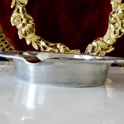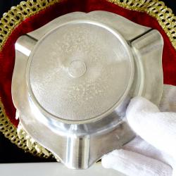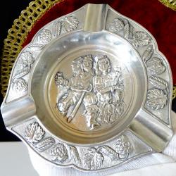 Западно Германски калаен пепелник, майсторска ръчна изработка от 95% калай и 5% сребро, маркиран с инициалите на световно известната фабрика BMF. В центъра е декориран с прецизно изваяно релефно изображение на Дама с бутилка и чаша в ръце и Кавалер с чаша и сабя. Щастлива двойка, може би съпрузи, които имат повод да се забавляват. Периферията на пепелника е декорирана с хмел и ечемик, което подсказва, че питието е бира. Високо качество със сребърен блясък, идеален подарък за калаена сватба, семейство. Диаметър 14 см., височина 2.5 см., тегло 340 гр.