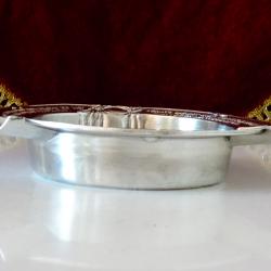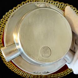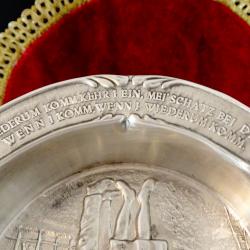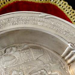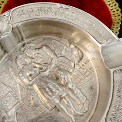 Старинен немски калаен пепелник, майсторска ръчна изработка от 95% калай и 5% сребро, печат на световно известната марка SkS. Декориран с прецизно изваяна картина, която изобразява сцена от любовна народна песен „Muss I denn”. В нея се разказва, че мъж тръгва на път и се разделя с дамата на сърцето си. Той се заклева да й остане верен и да се ожени за нея, когато се върне в родния град. Песента е любима на моряци, военни и търговци. Тя е една от най-известните, благодарение на адаптацията на Елвис Пресли и на Джо Доуъл. Периферията на пепелника е декорирана с релефно гравиран текст на избрани стихове от песена и красиви барокови орнаменти. Диаметър 12.5 см., височина 3 см., тегло 140 гр. Идеален подарък за калаена сватба, младоженци, влюбени.
