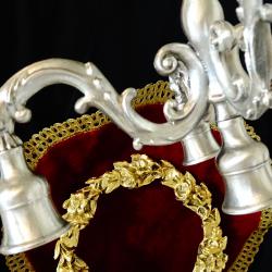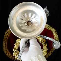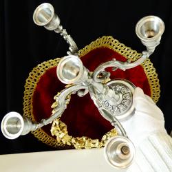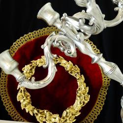Стар калаен свещник петица, свещник за пет свещи, петорен свещник, канделабър, майсторска ръчна изработка от 95% калай и 5% сребро, маркиран с релефен печат на производителя. Декориран с прецизно изваяни релефни барокови орнаменти, свещника блести като сребърен. Ръчно отлят, изключително масивен, свещника е ценен и практически вечен, защото не е сглобка от отделни елементи върху стоманен винт като повечето свещници. Височина 22 см., диагонал 25 см., диаметър на основата 9 см. Тегло 1 кг. Незабравим подарък за калаена сватба, като символ на огъня, светлината и топлината в семейството.