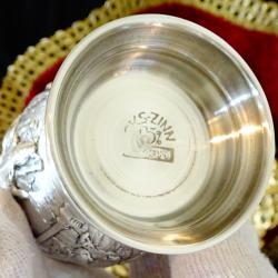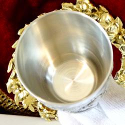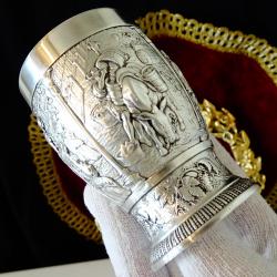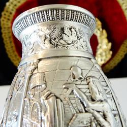 Стара калаена чаша за вино, ракия, ликьор, майсторска ръчна изработка от 95% калай и 5% сребро, маркирана с инициалите на световно известната западно германска марка SkS. Чашата има 4 прецизно изваяни релефни картини, които представят етапите на винопроизводството – гроздобер, транспортиране, мачкане на гроздето и дегустация в избата. Основата е декорирана с релефни лози и грозде. Височина 8 см., диаметър 5.5 см., тегло 115 гр. Вместимост 100 мл.