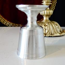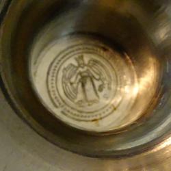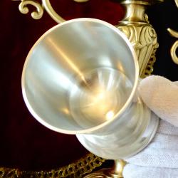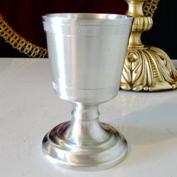 Стара немска калаена чаша за вино и ракия, майсторска ръчна изработка от 95% калай и 5% сребро, маркирана с релефен печат на производителя. Декорирана с нежен релеф и красиво гравиран надпис Stadtmeisterschaft – градско първенство от 1986 година. Чашата има масивно релефно столче. Високо качествена и много блестяща от вън и от вътре. Височина 9 см., диаметър 6 см., тегло 150 гр. Вместимост 120 мл.
