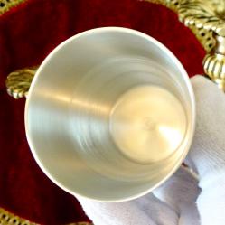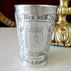 Стара немска калаена чаша за вино, майсторска ръчна изработка от 95% калай и 5% сребро, маркирана с релефен печат на производителя. Декорирана с прецизно изваяни градски гербове, разделени от красиви плетеници с хмел и ечемик, реверанс към производството на бира. Чашата блести като сребърна от вън и от вътре, идеална за ползване, декорация и подарък. Височина 8.5 см., диаметър 6 см., тегло 130 гр., вместимост 180 мл.