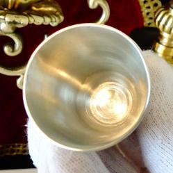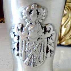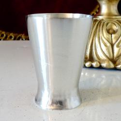 Стара немска калаена чаша за ракия, ликьор, майсторска ръчна изработка от 95% калай и 5% сребро. Декорирана с релефно изваяни хералдически символи – рицар, кръстосани пушки, орел с разперени криле и красиви орнаменти. Чашката блестят като сребърни от вън и от вътре, идеални за ползване, декорация и подарък. Височина 5 см., диаметър 4 см., тегло на всяка 50 гр., вместимост 50 мл.