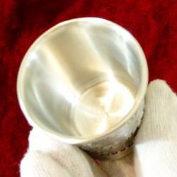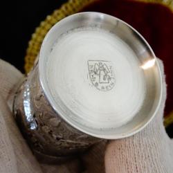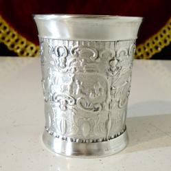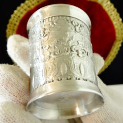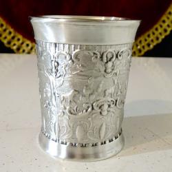 Стара калаена чаша за ракия, ликьор, майсторска ръчна изработка от 95% калай и 5% сребро, маркирана с печат на производителя. Декорирана с релефна ловна сцена – елени сърни с малки и ловно куче. Около тях ангелски лица и красиви орнаменти. Блести като сребърна от вън и от вътре. Височина 5 см., диаметър 4.5 см., тегло 70 гр. Вместимост 50 мл.