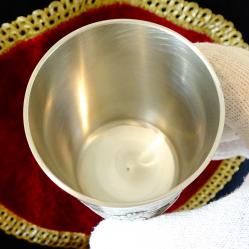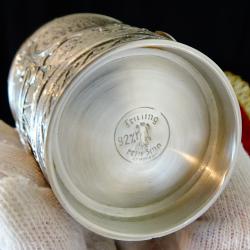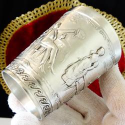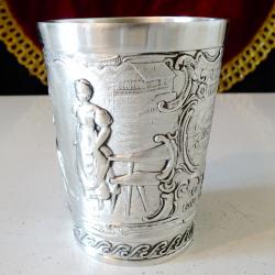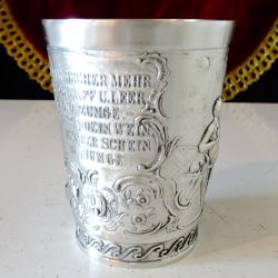 Стара немска калаена чаша за вино, майсторска ръчна изработка от 92% калай и 8% сребро, маркирана с печат на производителя. Декорирана с прецизно изваяна релефна сцена от популярната любовна песен Lindenwirtin. В нея се разказва за красива кръчмарка, която грабва сърцето на младежа, а неговата чаша е винаги пълна. Високо качество със сребърен блясък. Чашата е незабравим подарък за калаена сватба, семейство, младоженци. Височина 7.5 см., диаметър 6 см., тегло 130 гр. Вместимост 150 мл.