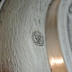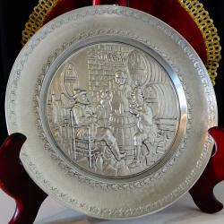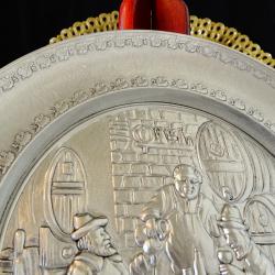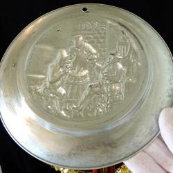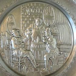Стара немска калаена чиния за стена, пано, майсторска ръчна изработка от 95% калай и 5% сребро, маркирана с печат на производителя. В центъра има прецизно изваяна релефна репродукция на картината „В манастирската изба” на немския художник Eduard von Grützner. Периферията на чинията е декорирана с дъбови клонки, като красива рамка на тази любима битова сцена. Има стабилна окачалка за стена. Високо качество със сребърен блясък. Диаметър 19 см., височина 2 см., тегло 250 гр.