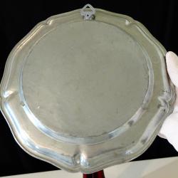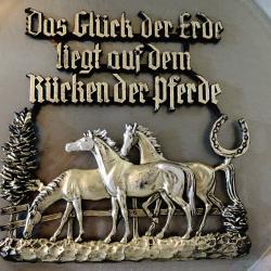 Стара немска калаена чиния за стена, пано за стена, майсторска ръчна изработка от 95% калай и 5% сребро, маркирана с печат на производителя. Декорирана с релефно изображение на Коне, подкова и поговорка, която гласи „ Най-голямото щастие на Земята се намира на гърба на кон. ”Паното е идеален подарък за семейство, калаена сватба, рожден ден, юбилей, като пожелание за щастие, свобода и просперитет. Диаметър 22 см., височина 2 см., тегло 310 гр.