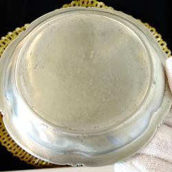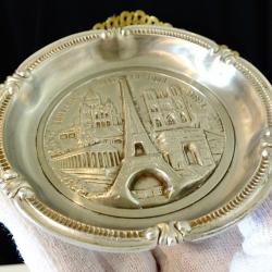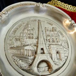 Стара калаена чиния, купичка за ядки, пепелник, майсторска ръчна изработка от 95% калай и 5% сребро. Декорирана с прецизно изваяни релефни изображения на Айфеловата кула, Триумфалната арка, Нотр-Дам, Акрополът в Атина, катедралата Свети Петър в Рим, Ватикана. Периферията е декорирана с красиви релефни орнаменти в стил Art Nouveau. Диаметър 10 см., височина 1.5 см., тегло 90 гр.