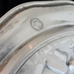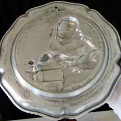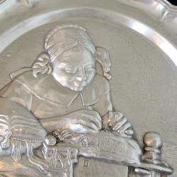 Стара немска калаена чиния, пано, релефна картина, майсторска ръчна изработка от 95% калай и 5% сребро, маркирана от производителя. В центъра има прецизно изваяна релефна репродукция на картината Плетачката на дантели от холандския художник Йоханес Вермеер. Има стабилна окачалка за стена. Диаметър 23 см., височина 1.5 см., тегло 220 гр.