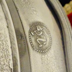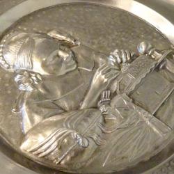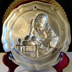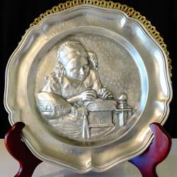 Стара немска калаена чиния за стена, пано, релефна картина, майсторска ръчна изработка от 95% калай и 5% сребро, маркирана от производителя. В центъра има прецизно изваяна релефна репродукция на картината Плетачката на дантели от Йоханес Вермеер. Високо качество със сребърен блясък. Диаметър 22 см., височина 2 см., тегло 320 гр. Идеален подарък за калаена сватба.