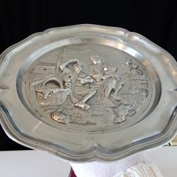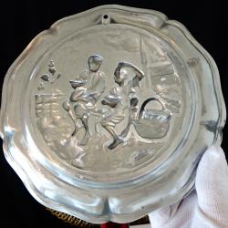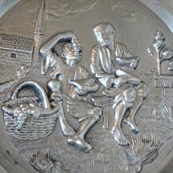 Стара немска калаена чиния, пано, релефна картина, майсторска ръчна изработка от 95% калай и 5% сребро, маркирана от производителя. В центъра има прецизно изваяна релефна репродукция на картината Ядящи грозде и пъпеш на испанския художник Бартоломе Естебан Мурильо - 17 век. Има стабилна окачалка за стена. Диаметър 23 см., височина 1.5 см., тегло 310 гр.
