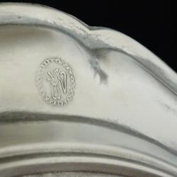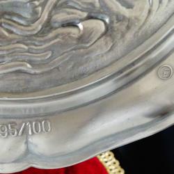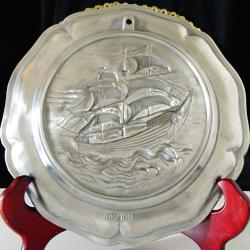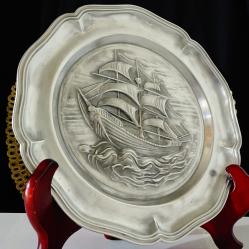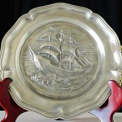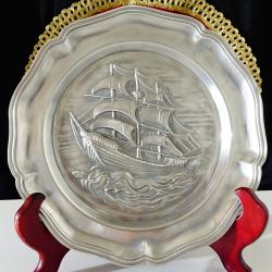 Стара калаена чиния за стена, пано, майсторска ръчна изработка от 95% калай и 5% сребро, маркирана от производителя. В центъра е декорирана с прецизно изваяно релефно изображение на английски боен кораб, платноход, линеен кораб в океана с разпънати платна. Диаметър 22.5 см., височина 1.5 см., тегло 270 гр. Идеален подарък за калаена сватба, като пожелание за попътен вятър.