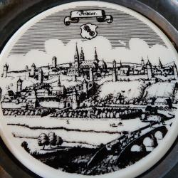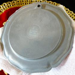 Стара немска калаена чиния, пано, подложка за чаша, майсторска ръчна изработка от 95% калай и 5% сребро, маркирана от производителя с два печата. В центъра има ръчно рисуван порцелан графика с пейзаж на китното градче Fritzlar. Диаметър 10 см., височина 1 см., тегло 90 гр.