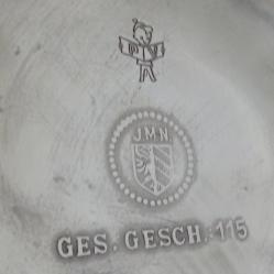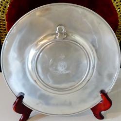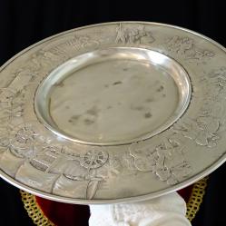 Стара немска калаена чиния, поднос, плато, майсторска ръчна изработка от 95% калай и 5% сребро, маркирана като патентован модел. Периферията е декорирана с красива релефна картина на средновековен търговски керван, съпровождан от въоръжени войници – тежко натоварени каруци, теглени от голям впряг дорести коне, войниците имат ризници, мечове, копия. Много колоритна чиния, плато, която може да се ползва по предназначение и като декорация. Идеален подарък за калаена сватба. Диаметър 24 см., височина 1.5 см., тегло 500 гр.