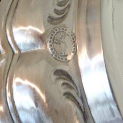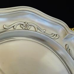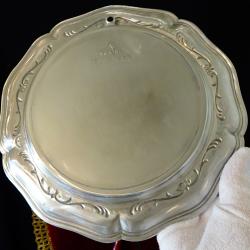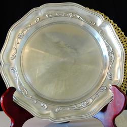 Стара немска калаена чиния за стена, пано, майсторска ръчна изработка от 95% калай и 5% сребро, маркирана с печат на производителя, като патентован модел. Периферията е декорирана с красиви релефни орнаменти в стил Art Nouveau. В центъра е гладка за гравиране на пожелание за калаена сватба или поставяне на снимка на семейството. Има стабилна окачалка за стена. Високо качество, масивност и сребърен блясък. Диаметър 23 см., височина 2 см., тегло 320 гр.
