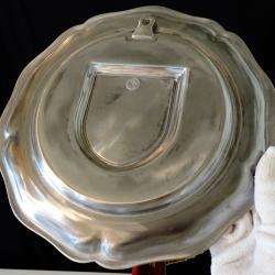 Стара немска калаена чиния за стена, калаено пано, ръчно отлята от масивен 95% калай и 5% сребро, маркирана с печат на производителя. Предназначена за незабравим подарък за калаена сватба, рожден ден, юбилей, чинията има релефна рамка за поставяне на снимка и възможност за гравиране на надпис около нея. Има стабилна окачалка за стена. Диаметър 23 см., височина 2 см., тегло 590 гр.