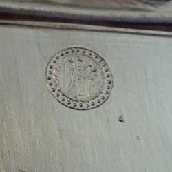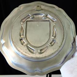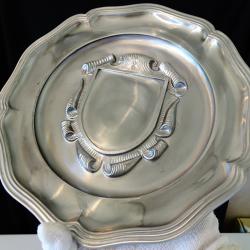 Стара калаена чиния за стена, пано, майсторска ръчна изработка от 95% калай и 5% сребро, маркирана с релефен печат на производителя. В центъра има релефно декорирана рамка с дизайн на рицарски щит. Предназначена за гравиране на персонализиран текст, снимка и др., като незабравим подарък за специален повод – калаена сватба, рожден ден, юбилей и др. Диаметър 23.5 см., височина 2 см., тегло 640 гр.
