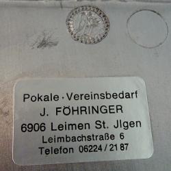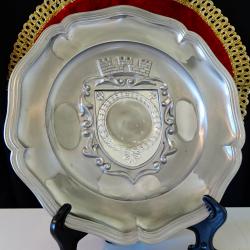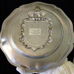 Стара калаена чиния за стена, пано, майсторска ръчна изработка от 95% калай и 5% сребро, маркирана с релефен печат на производителя, плюс запазен етикет от ателие за трофеи. В центъра има релефна рамка с дизайн на рицарски щит, декорирана с ефектни барокови орнаменти, красив лавров венец и кралски символи – бурбонска лилия. Над щита е изобразен релефен замък с три високи кули, който прилича на кралска корона. Богати хералдически символи за сила, единство, слава и благополучие. Незабравим подарък с обособени места за гравиране на персонализиран текст и снимка за калаена сватба, семейство, рожден ден, юбилей или друг специален повод. Диаметър 23 см., височина 2 см., тегло 660 гр.