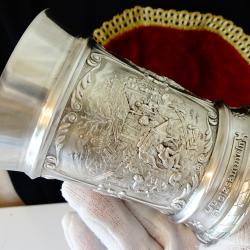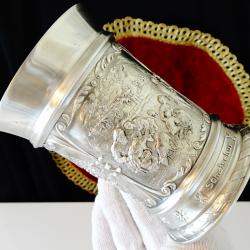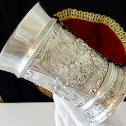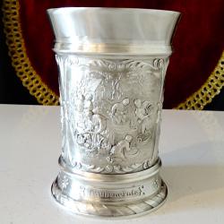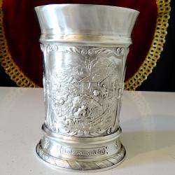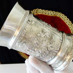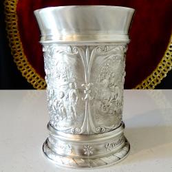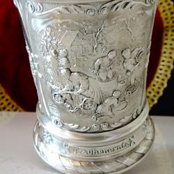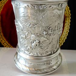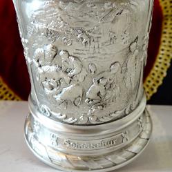 Стара немска калаена чаша за вино, халба, майсторска ръчна изработка от 95% калай и 5% сребро, маркирана с инициалите на световно известната фабрика SkS. Декорирана с три прецизно изваяни релефни картини, които живописно рисуват селския бит: