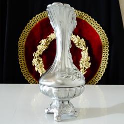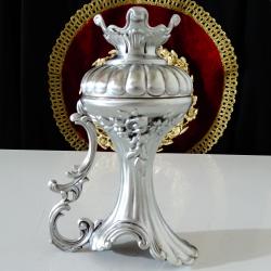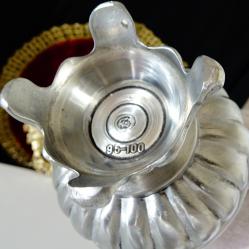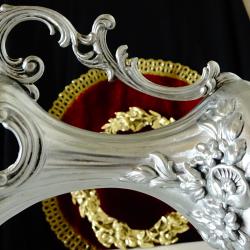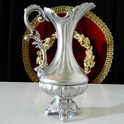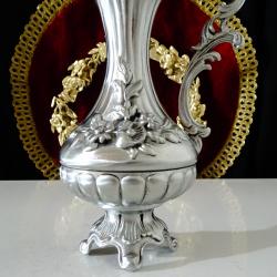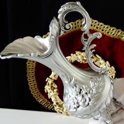 Стара италианска калаена кана, майсторска ръчна изработка от 95% калай и 5% сребро, маркирана от производителя. Декорирана с разкошни релефни цветя и орнаменти в стил рококо. Стои стабилно на четири изящни крачета. Височина 18 см., дължина 12 см., диаметър 9 см., тегло 340 гр. Вместимост 300 мл.