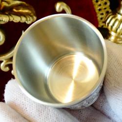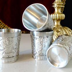 Стари немски калаени чаши за ракия, майсторска ръчна изработка от 95% калай и 5% сребро, маркирани с релефен печат на производителя Grenningloh, както и със знак за високо качество. Декорирани с три релефни картини – ловен тръбач с кон, ангел или херувим с лък и стрели, кръстосани пушки, мишена с еленови рога над тях. Всяка картина е обградена от красиви релефни орнаменти. Чашките са в перфектно състояние, като нови, идеални за ползване, декорация и подарък за калаена сватба. Височина 5 см., диаметър 4 см., тегло на всяка 60 гр., вместимост 50 мл. Налични 4 броя, цена 9.99 €., за брой.