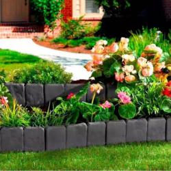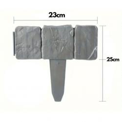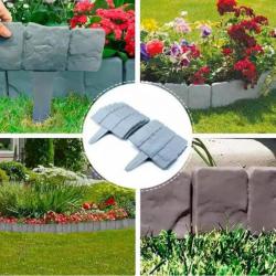 Продукт: Каменна градинска ограда / градински бордюр (комплект); Материал: PP пластмаса, устойчива на атмосферни влияния; Размер на елемент: 25 x 23 см; Цвят: сив; Брой в комплект: 10 броя; Обща дължина: приблизително 2,3 м; Монтаж: ръчен, чрез вграден кол, без нужда от инструменти; Приложение: разделяне на тревни площи, цветни лехи, алеи и декоративни зони.