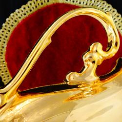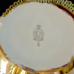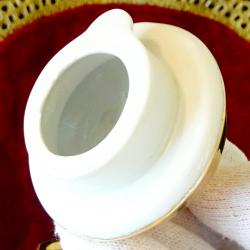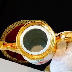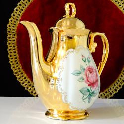 Баварска порцеланова кана за кафе, чай, баварски костен порцелан с приказен бароков релеф, ръчно рисувана с 24 карата злато и красива роза, заобиколена от ефектни златни барокови орнаменти. Лека, грациозна, каната е маркирана Schaller Wiesau Bavaria, датира от 1950 г., перфектна. Височина 19 см., диаметър 11 см., дължина 19 см., вместимост 700 мл. Каната е част от сервиз за кафе за двама, който може да разгледате подробно в моите обяви.