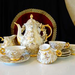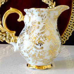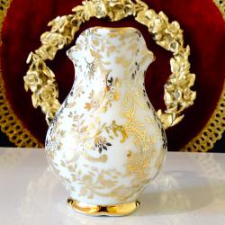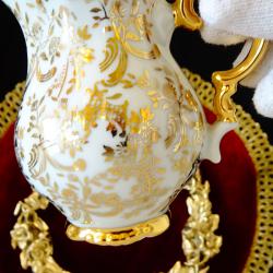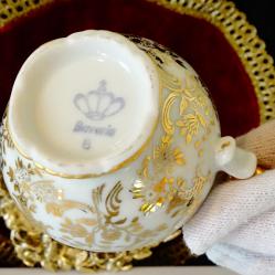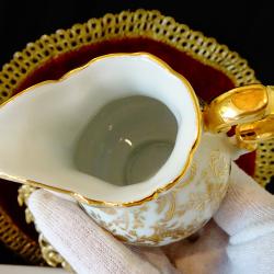 Стара порцеланова каничка, латиера Бавария, баварски костен порцелан, ръчно декорирана с цветя и барокови орнаменти от 24 карата злато. Маркирана с печат на производителя. Изключително качествена и блестяща позлата. Порцелана е релефно декориран с барокови орнаменти. Височина 9 см., дължина 10 см., диаметър 7 см., вместимост 180 мл. Перфектна. Каничката е част от сервиз за кафе от кана, каничка и чаши с чинийки, който може да разгледате в моите обяви.
