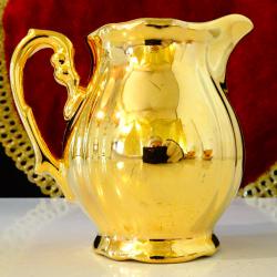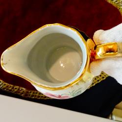 Баварска порцеланова каничка за мляко, сметана, баварски костен порцелан, ръчно декорирана с чисто злато 24 k Gold и красива роза. Порцелана е лек, декориран с най-красивия бароков релеф. Каничката е маркирана Schaller Wiesau Bavaria, датира от 1950 година. Височина 8 см., дължина 9 см., диаметър 7 см. Вместимост 160 мл. Перфектна.